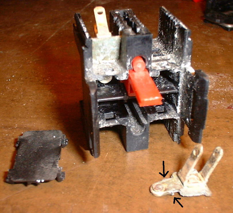 Darunter ist nochmal eine kleine Abdeckung (im Bild links) die sich heraushebeln läßt. Jetzt kann man die Kontakte sehen. Zur einfacheren Reinigung kann man die festen Kontakte mit den Anschlußfahnen vorsichtig nach oben heraushebeln. Sie werden von zwei seitlichen Rastnasen (Pfeile) gehalten. Solange man nur jeweils einen Anschluß herausnimmt bleibt die Kontaktbrücke mit Feder und Betätigung (rot) im Gehäuse und fliegt nicht in der Gegend herum. Auf dem Bild sieht man gut die weißen „Ausblühungen“. Nachdem man diese Korrosionsprodukte von den Kontaktfächen abgekratzt hat kann man alles wieder zusammen „snappen“. Ein Kontaktspray oder „Multi 7“ von Liqui Moly verhindern, daß die Korrosion vorzeitig wieder zuschlägt.