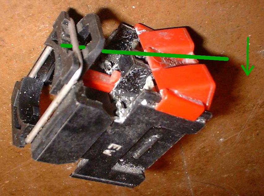 Eventuell ist es dazu nützlich, das Tiefzieh-Plastikteil auf dem sogenannten „Angelrahmen“, in dem die Schalter und die Anzeige sitzen, an der Unterkante loszuschrauben (6 Kreuzschlitzschrauben) und etwas nach oben zu drücken. Man muß mit einem kleinen Schraubenzieher (z.B. von der Schießbude - im Bild durch grünen Strich dargestellt) den Federbügel, der das Kontaktteil an der Betätigung hält, nach oben hebeln. Drehpunkt ist dabei die rote Anschlußabdeckung, die Kraft muß in Pfeilrichtung gehen. Der über dem Metallbügel liegende Kunststoffbügel verhindert dabei, daß der Metallbügel ganz abgehebelt wird. Das Kontakteil löst sich und kann nach unten weggenommen werden. Nun lassen sich die Kabel leicht abziehen.