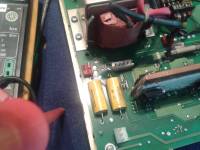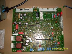 Die PFC ist eine Schaltung, welche die Blindbelastung auf einem einphasig belasteten Wechselstromnetz reduzieren und den Wirkungsgrad eines Schaltnetzteiles erhöhen soll. Dieses macht sie, in dem sie als sog. Sperrwandler die gleichgerichtete Eingangspannung minimal erhöht (Hochsetzsteller). Dabei achtet sie genau auf die Lastimpulse des nachgeschalteten Wandlers und sorgt somit dafür, daß möglichst genau im Lastmoment, die Ladespule Ihre maximale Leistung hat. Die PFC auf dem Tebechop 1700 ist mit einem älteren PFC IC ausgestattet, der nicht unbedingt als „Feld-Wald-und-Wiese“ zu bezeichnen ist. Auch ist die Schaltungsart so aufgebaut, daß ein Fehler in der Spannungsversorgung so ziemlich alles an Halbleitern auf der Platine in die ewigen Jagdgründe schickt. Die Versorgung der Schaltung mit 17V geschieht direkt aus dem 290V DC Eingang über einen Keramikwiderstand, einen FET -als Linearregler (20V); und dann über einen NPN Transistor wiederum als Linearregler. Kommt es zu einem Fehler in dieser Serie, so liegen volle 290V DC an allen Bauteilen der PFC. Dadurch werden sofort die beiden komplementären Schaltverstärker (TO220 Bipolar), die 12V Zenerdiode, der PFC zwischen PIN 16 und 1, sowie einige weitere Dioden und LM358 gehimmelt. Ebenso kann es auf dem Powerboard die 18V Zenerdiode mit dem TO220 Transistor für die Stabilisierung und natürlich den Keramikwiderstand mit dem FET sehr schnell in Mitleidenschaft ziehen. Auf dem PFC-Board geht dann auch eine Leiterbahn in Plasma auf -leicht zu erkennen.