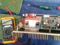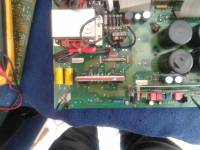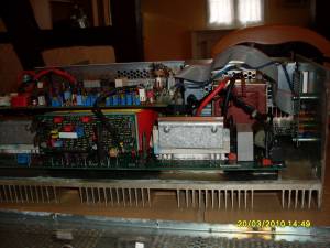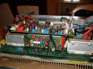 Zusammen mit dem Trafo oben links ergibt sich ein Vollbrückenwandler. Die beiden Übertrager werden jeweils von einem Halbwellentreiber angesteuert und schalten ihrerseits jeweils die gegenläufigen FETs. Die beiden Kondensatoren unten links sind die Wellenformer, welche den Sinus aus den Rechteckpulsen formen. Rechts oben neben dem Trafo befindet sich der Phasensensor -die kleine Spule mit dem einfachen Draht; welche den Trafo überwacht und das Signal auf die Steuerplatine zurückführt. Links unten der Stecker welcher zu einem 65Ohm Leistungswiderstand führt. Er dient wohl als Shunt, auch wenn mit sein Wert etwas hoch vorkommt.