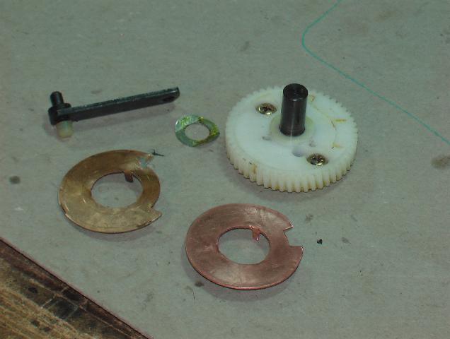 Ich habe allerdings auch die Kupfer-Steuerscheibe für die Abschaltung neu angefertigt, auch weil die mitgelieferte ein sehr großzügig bemessenes Segment für die Abschaltung hat, d.h. man muß relativ lang auf den Wischerschalter tippen, bis er von selbst weiterläuft. Auf dem mitgesendeten Bild sieht man rechts im Bild deutlich das viel kleinere Segment der neuen Scheibe. Am Kunststoffzahnrad muß man zwecks planer Auflage einen Steg wegfräsen. Die Stahlscheibe mit der Winkellochung liegt unter dem Zahnrad.