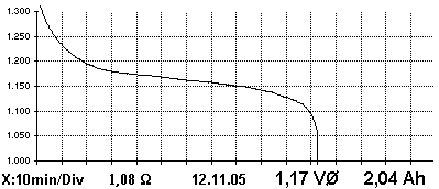 Typischer Spannungsverlauf eines neuen Marken-NiMH-Akkus Größe AA bei ca. 1,1 Ohm Last.