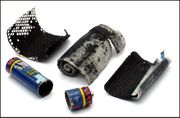 Das Bild zeigt die Komponenten eines geöffneten NiMH-Akkus. Die Lochfolie (links) dient als Träger für das Metallhydrid-Pulver, das die negative Elektrode bildet. Der Separator (Mitte) nimmt den Elektrolyten auf und verhindert den unmittelbaren Kontakt zur positiven Elektrode. Diese besteht aus einem Blech aus schwarzem Nickeloxid-Hydrat (rechts).