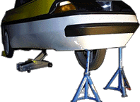 Man kann das El auch auf 2-3 gestapelte Europaletten stellen. Darauf ein Teppich, damit es nicht zerkratzt, auf die nach unten stehenden Gummipropfen und Masseschraube achten! Eine kräftige Person hebt die Schnauze an (Handbremse?), ein Helfer schiebt die Paletten darunter, soweit wie möglich nach hinten, ohne die Hinterräder zu berühren. Die oberste Palette wird angekippt, so daß sie parallel zum Boden des Els geneigt ist. Beim Ablassen der Schnauze rollt so die oberste Palette auf der nächsten ab und der Boden des Els wird nicht durch scharfe Kanten belastet. Ein weiterer Helfer kann beim Anheben und Absenken helfen, indem er sich auf die Kante des Kofferraums setzt. Das El steht auf 2-3 Europaletten sehr sicher und kann nicht abrutschen. Weiterer Vorteil: Alle Räder lassen sich frei drehen und man hat bei 3 Paletten viel Platz, um von unten zu arbeiten.