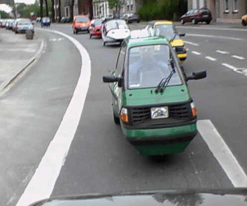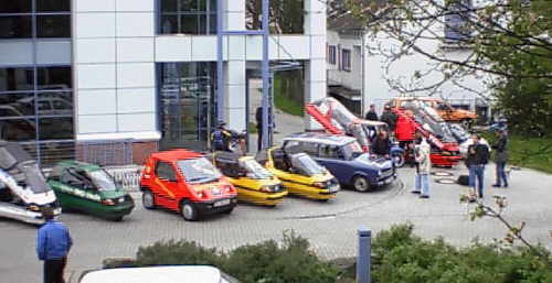 | Das Kennzeichen EE läßt mich sofort an Jürgen aus Finsterwalde denken und richtig, keine 1000m vom Museum entfernt hat er in(!!!) seinem EL übernachtet! Keiner konnte Ihm gestern sagen, wo das Museum ist und so hatte er in der Dunkelheit aufgegeben! Um so mehr freut er sich mich zu sehen! Als wir am Museum sind, sind die ersten Teilnehmer schon wach und wir decken gemeinsam den Frühstückstisch. Nach einem ausgiebigen Frühstück geht es, mit kleinem Pressetermin der örtlichen Presse los in Richtung Essen. Die Fahrt von 22km Länge verlief ohne Zwischenfall. Leider ist es wegen der vielen Ampeln nicht möglich immer auf alle Teilnehmer zu warten, so das wir uns ein wenig verlieren. Aber mit 5 EL´s, einem E-Motorrad und einem Twike durch die Gelsenkirchener Innenstadt ist schon ein prima Ding! |