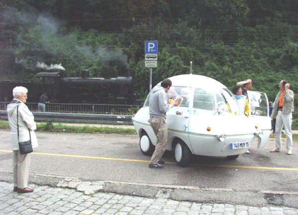 Im Hintergrund eine Dampflok am Karlsplatz in Heidelberg, im Vordergrund ein Elektrofahrzeug, dass der Serie "Raumschiff Orion" entsprungen sein könnte. |